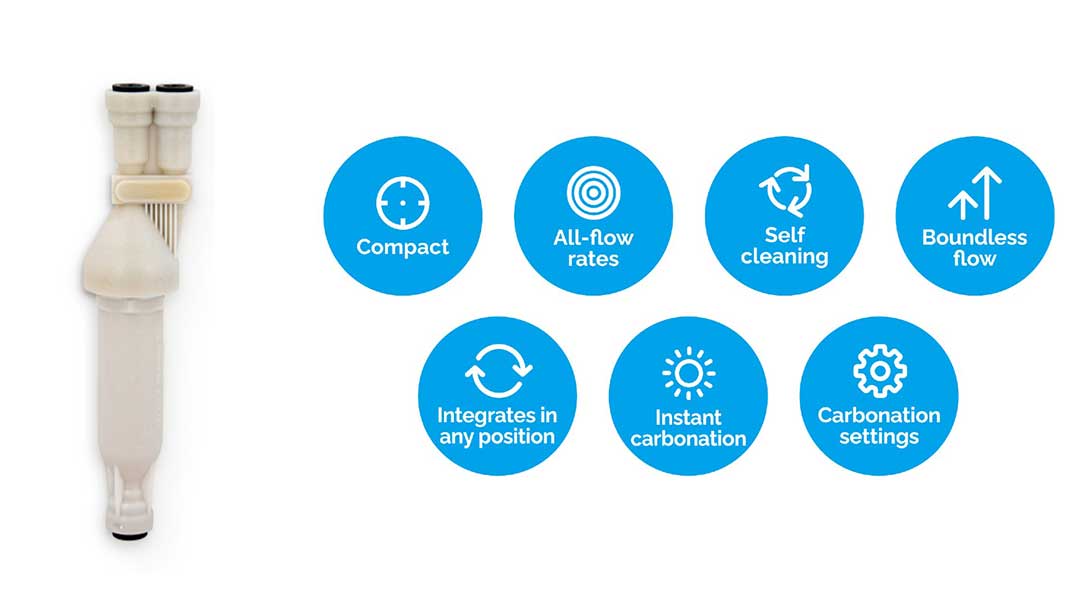 Introducing the BubbleBox AQUA, an all-in-one countertop system designed for direct connection to water source. This convenient system incorporates the CO2 cylinder directly into its housing, making it an ideal solution for office environments.